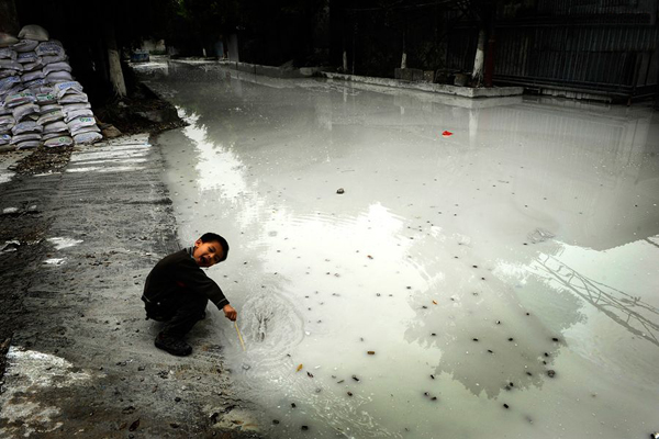 少數有污水池的一家麻將廠裡,一位工人正用水管把污水吸到污水收集車上運走處理。那些“無路可走”的泥漿和塑膠碎屑的廢水流到廠房後面的空地上,形成巨大的污泥池,有些工廠側面的幹道甚至被整個淹沒。越來越多的廢渣和粉塵堆積路面,積水的顏色越來越白。圖 (13) 一些運貨車緩緩經過,大半個輪胎被廢水淹掉。
